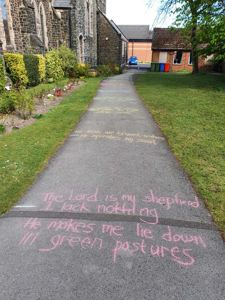 Good things that have happened this week: I have announced that I am moving on, I have met some new colleagues, I had zoom brunch with my cell group and a chat with another good friend. I have spoken to lots of people from church and very much enjoyed saying morning and evening prayer via GoTo meeting. Today I went out and drew a prayer walk in chalk down the side of church which, in the spring sunshine, was a complete joy.