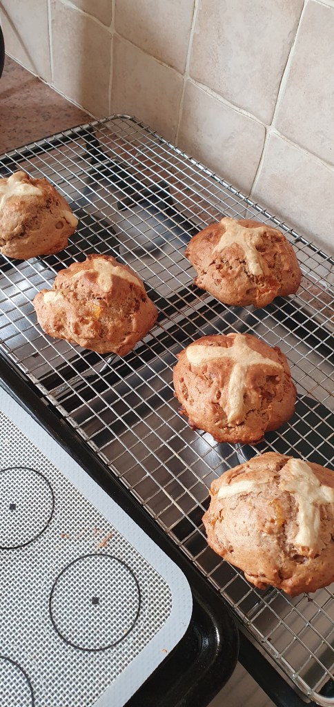10.20am This is another thing that would never usually happen in our house during Holy Week! I have baked hot cross buns! But friends from college shared a super easy and quick recipe (video here) and, as we had all the ingredients in, I thought I’d give it a go! The buns are due out of the oven at half past and I can’t wait!