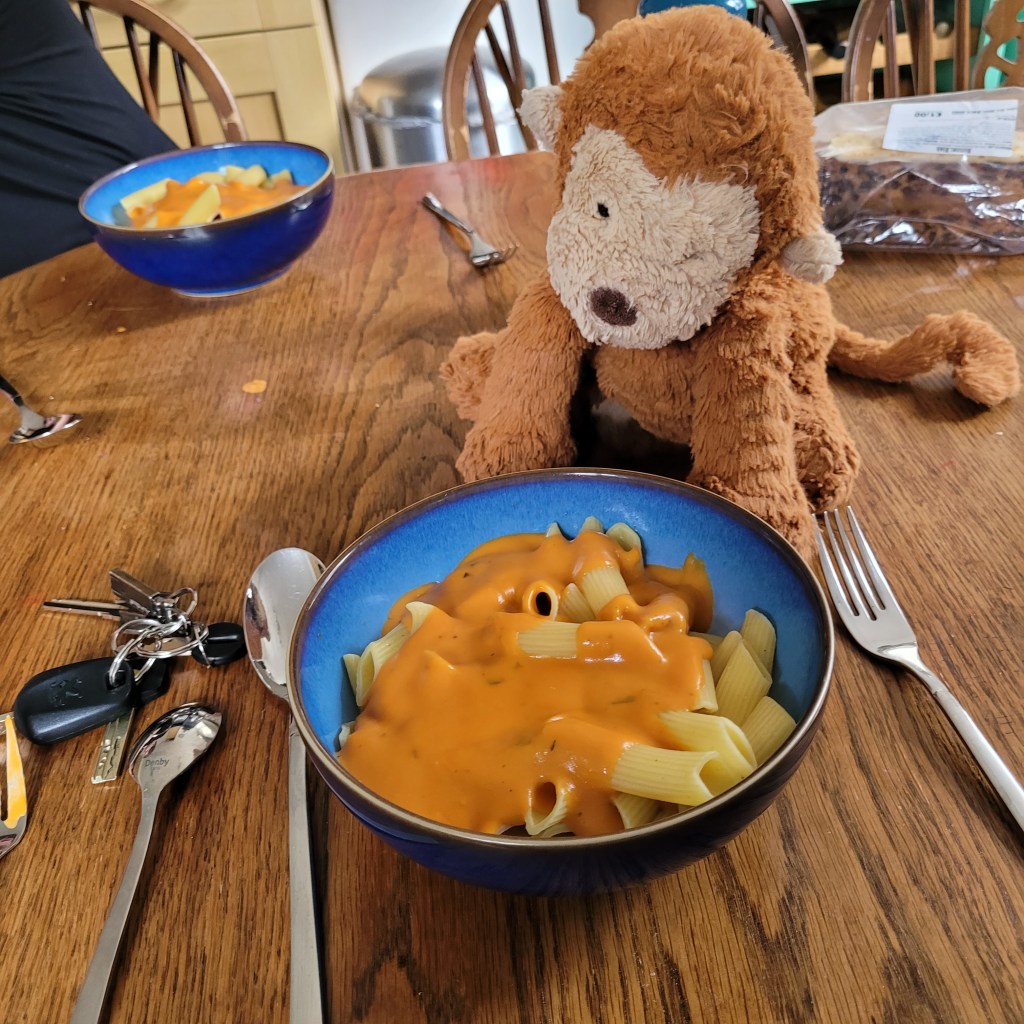 Anyway, as you can see, Amber monkey joined us for tea at Sophia’s request and she had a good go at her pasta and drank several helpings of juice. Now to have a bit of a play and get her down before I go out to Standing Committee in an hour.