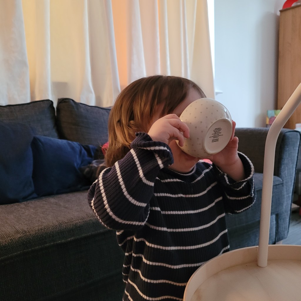 Sophia drinking cool tea poured from a teapot into a little cup!