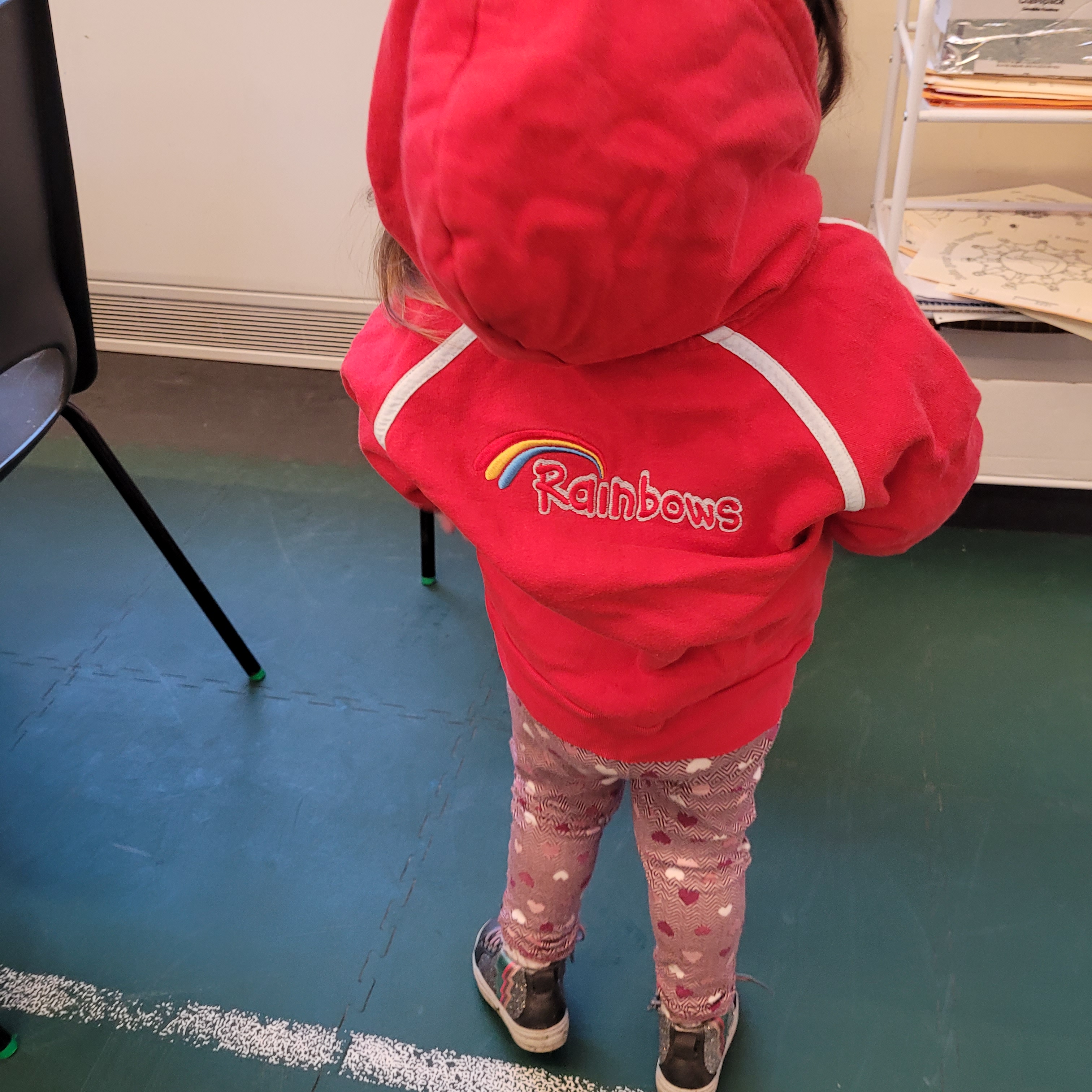 7.20pm Well that was fab! The Rainbows were so welcoming and completely included Sophia. They also listened to my story and were great when thinking about how the Easter story links to things like the Easter bunny and chocolate eggs. The leaders were wonderful and even gave Sophia a jumper to wear for the evening!