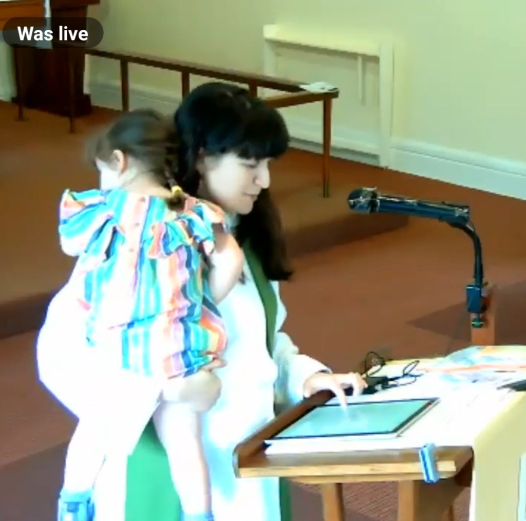 What Sophia said: well she tried to join in our Standing Committee meeting today by copying random words and phrases as people said them. ‘Outside… Sunday… meeting… Oh Mick!’