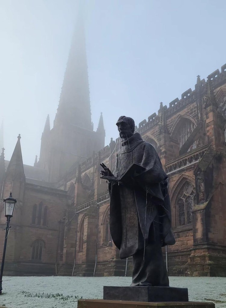 Anyway, next we went to Lichfield Cathedral, which was especially beautiful in the frost. This Cathedral is dedicated to St Chad, so he’s everywhere, and can be seen above draped in frosty cobwebs!