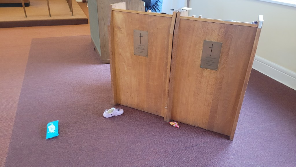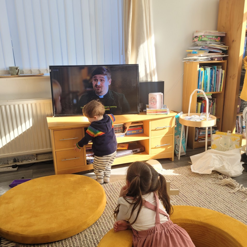 12.30 Well, that was a morning! Some services just go awry, and this was one of them. I stepped on my stole at least twice. Aidan was wandering about chatting to himself, and Sophia decided to copy him. She then managed to accidentally hit him with her umbrella, which I had to confiscate. She didn’t kick off too much, which is lucky, really, because all this happened during the sermon! I thought Aidan was going to choke on a choccy raisin during communion. It was a wild morning!